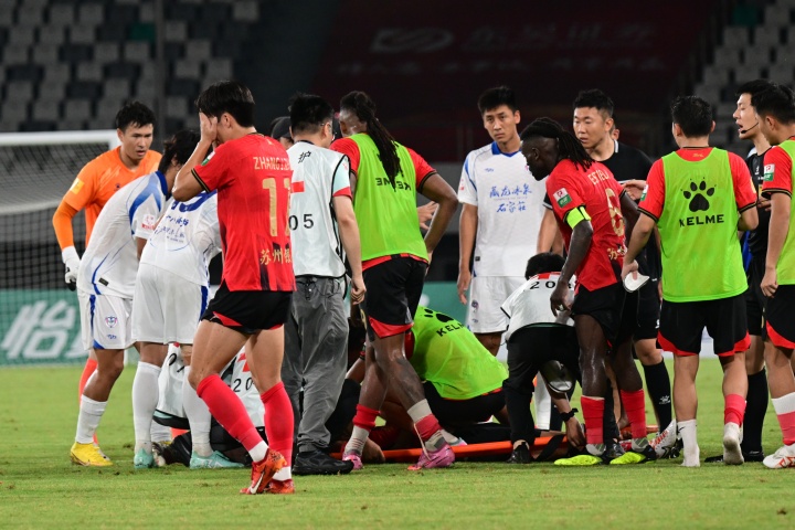 中甲第20轮,苏州东吴1-1石家庄功夫。比赛第92分钟,比赛突发景色,苏州东吴球员胡靖一刹倒地。