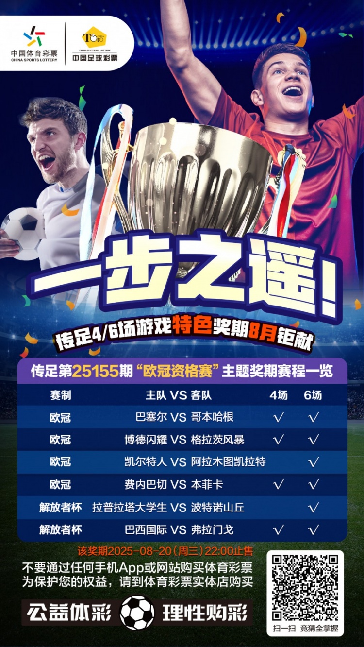第25155期传足4/6场游戏特质奖期照旧于2025年8月17日20:00开售,将于2025年8月20日22:00停售,并于8月21日开奖,其中巴塞尔VS哥本哈根、博德耀眼VS格拉茨风暴、费内巴切VS本菲卡、巴西海外VS弗拉门戈为4场进球游戏竞猜赛事。