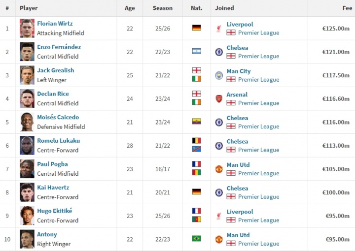 英超联赛历史引援转会费记录前十(单元:欧元):