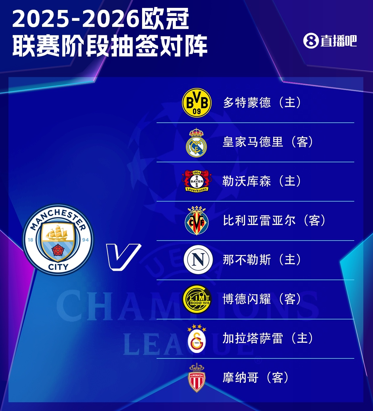 08月30日讯 欧足联官方公布欧冠联赛阶段赛程,曼城赛程如下。