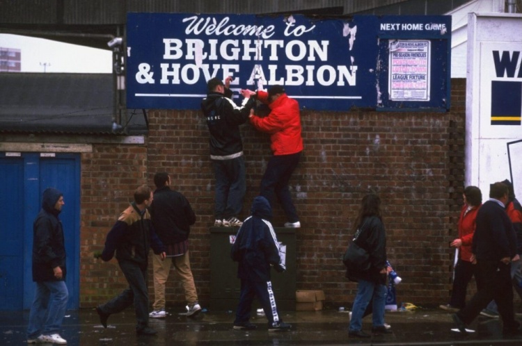 1997年,布莱顿球迷在金石球场临了一场比赛后寻找“顾虑品”