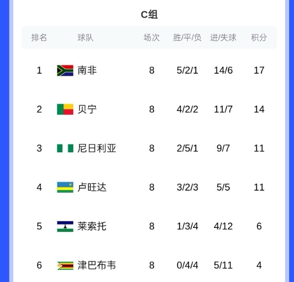8轮事后,尼日利亚2胜5平1负排在小组第三,进寰宇杯阵势致力。