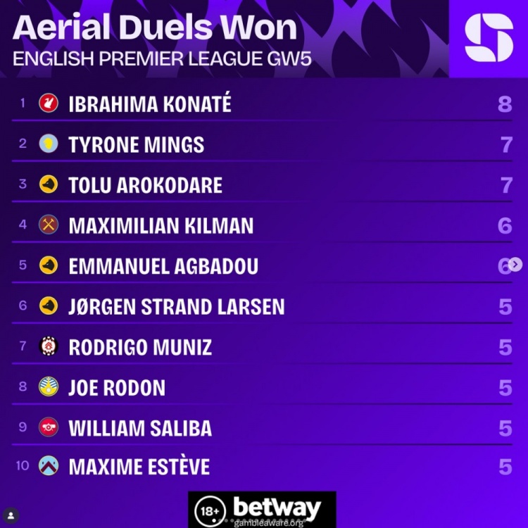 英超第5轮得到争顶次数榜:科纳特8次居首,明斯、阿洛科达尔7次