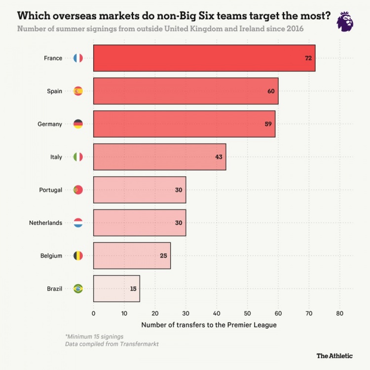 自2016年以来,非“BIG6”球队不息从欧洲主要联赛引援,其中法甲最多(72东说念主登陆英超),其次是西甲(60东说念主)、德甲(59东说念主)和意甲(43东说念主)。