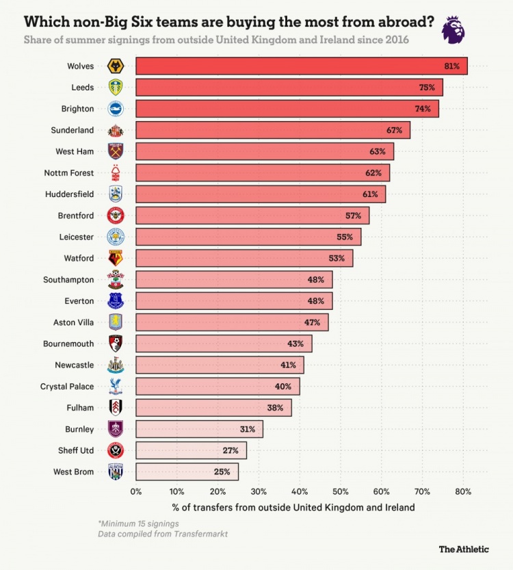 排在他们前边的是利兹联(75%),他们今夏已从外洋签下六名球员;以及狼队(81%),自2018年升超后一直专注于引进葡萄牙球员。