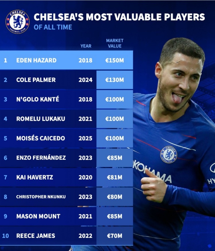 德转列切尔西队史身价最高榜:阿扎尔18年1.5亿,帕尔默昨年1.3亿