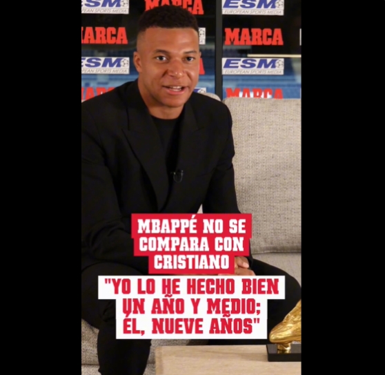 姆巴佩领取上赛季欧洲金靴,他禁受《马卡报》专访,谈到与C罗的相比。