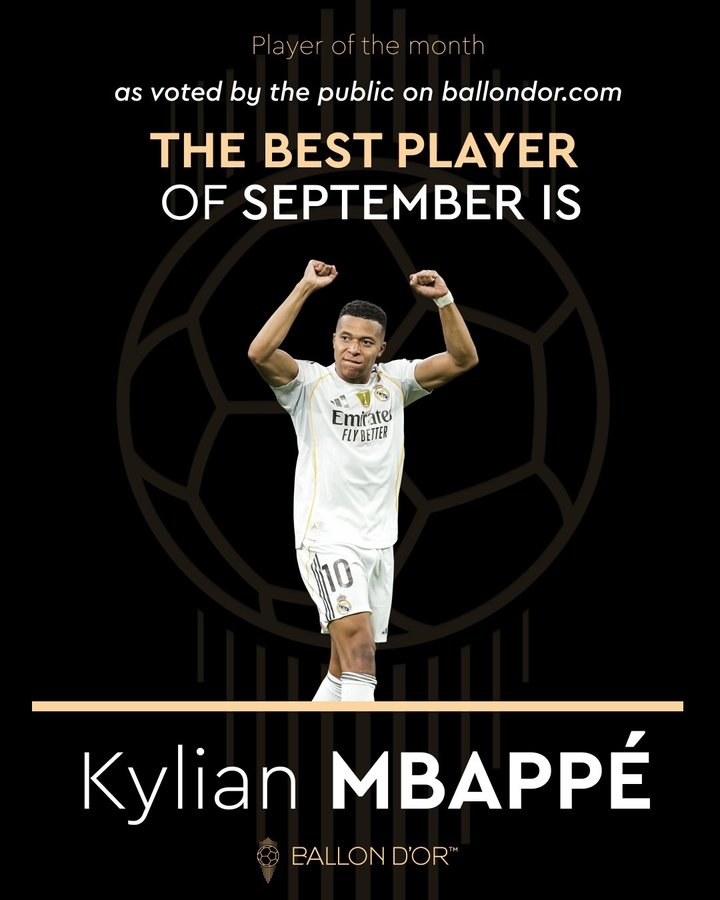 金球奖官方音书,姆巴佩当选金球奖9月份最好球员。