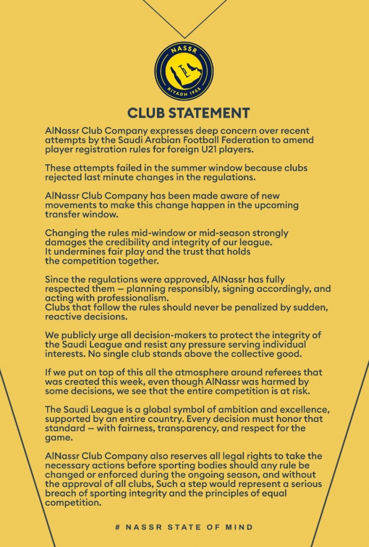 利雅获取手官方声明:反对沙特足协赛季中期修改U21外助限定