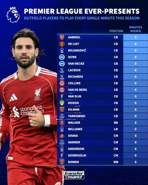 以下为本赛季于今保抓全勤的英超非门将球员名单: