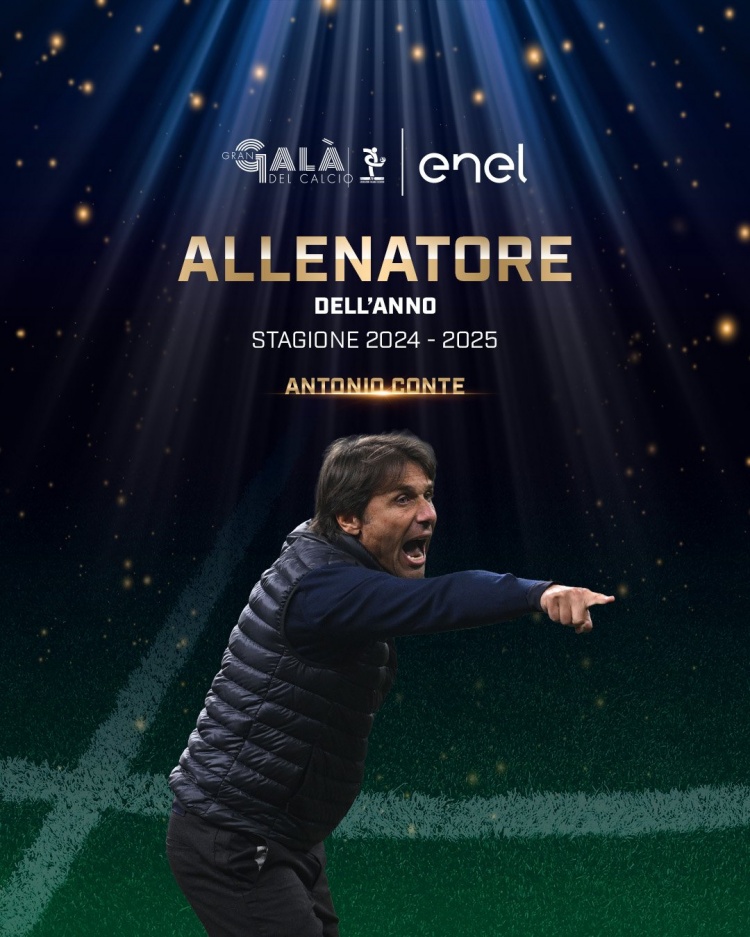 意大利球员协会社媒晒出海报,说明孔蒂当选2024-2025赛季最好教化。