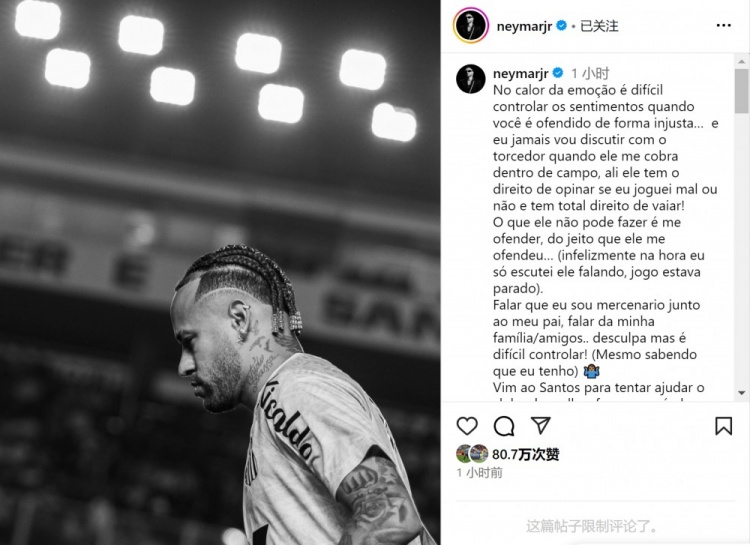 7月25日讯 内马尔社媒发文,回答与球迷碎裂事件,他示意我方与家东谈主受到了侮辱,这种情况下很难范畴心理。