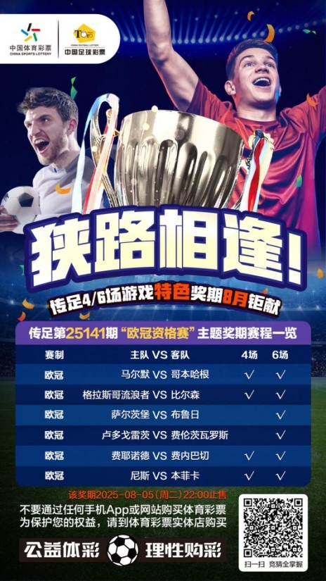 第25141期传足4/6场游戏特质奖期一经于2025年8月3日20:00开售,将于2025年8月5日22:00停售,并于8月7日开奖,其中马尔默VS哥本哈根、格拉斯哥流浪者VS比尔森、费耶诺德VS费内巴切和尼斯VS本菲卡为4场进球游戏竞猜赛事。