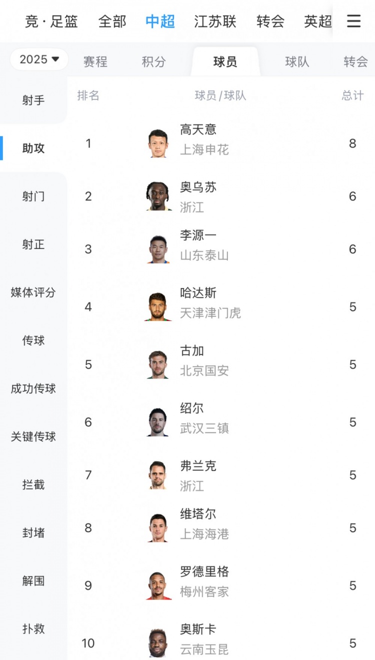 在本轮孝敬1传1射后,相连5轮联赛送助攻的申花中场高天意的助攻数来到8个,不息领跑助攻榜,奥乌苏、李源一则以6次助攻比肩排在第二位。