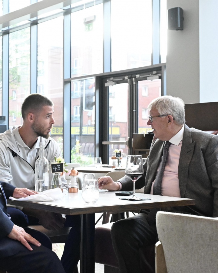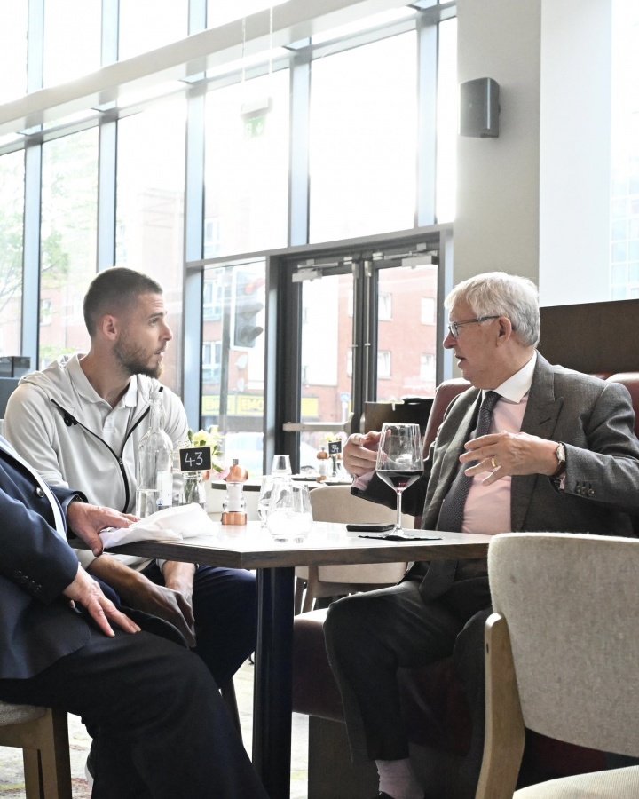 重聚❤️弗格森与德赫亚共进晚餐,两东谈主满脸笑貌拥抱热聊