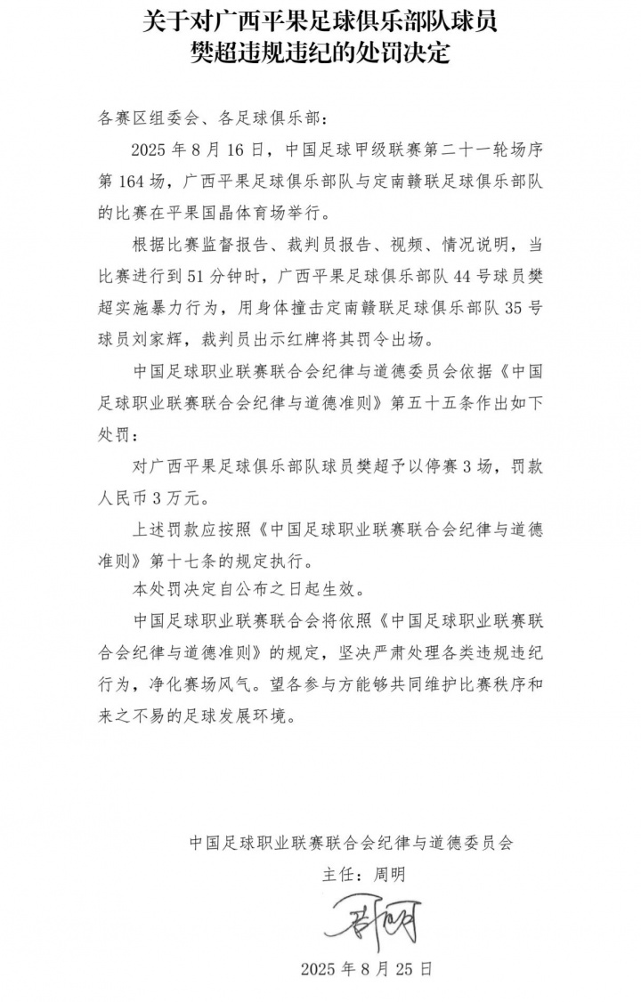 此外,在广西平果与定南赣联的比赛中,定南赣联王想寒犯规后有踩踏行动被出示红牌,他被处置停3场罚3万。广西平果球员樊超不异因暴力行为停3场罚3万。