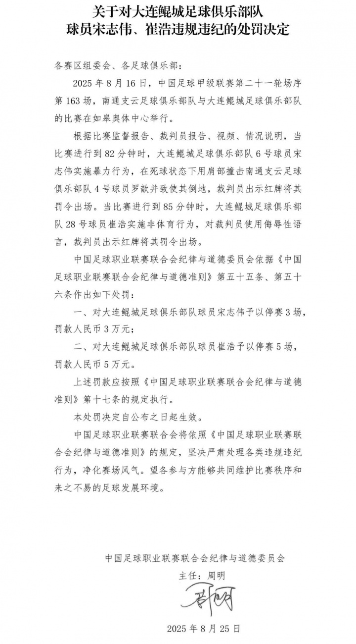 中足联发布罚单,对大连鲲城球员宋志伟和崔浩进行了处置,其中宋志伟停3场罚3万,崔浩停5场罚5万。