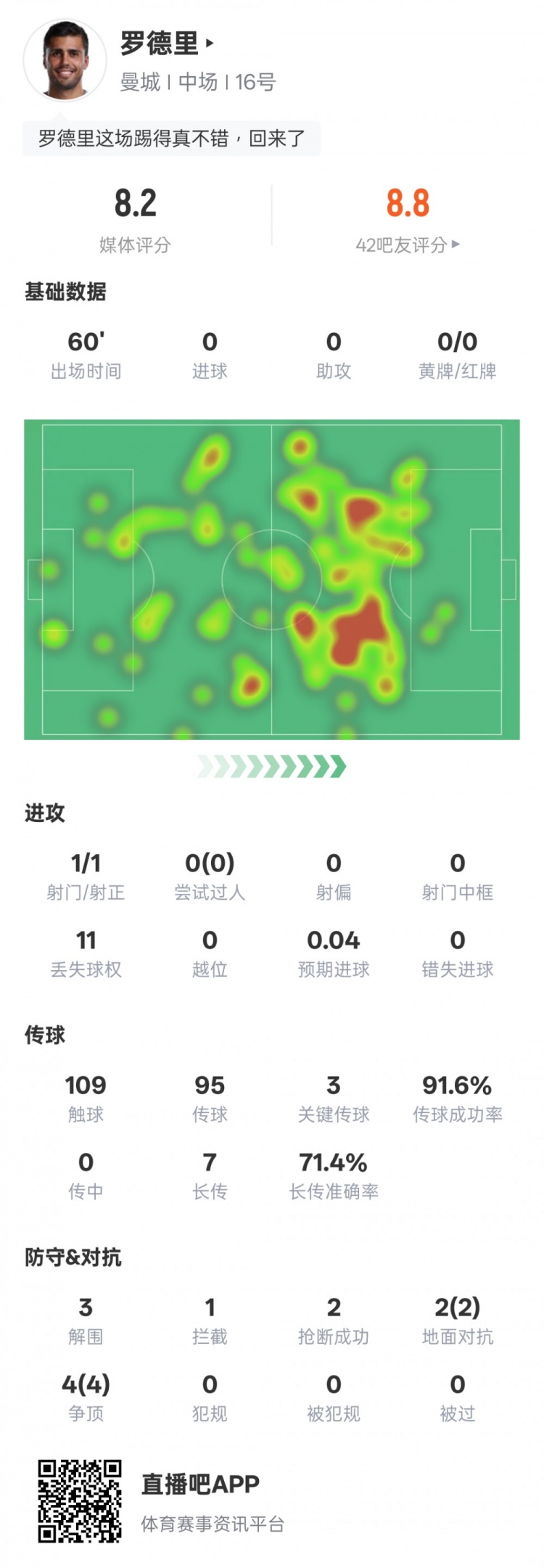 罗德里本场数据:3要道传球+6次抗拒均得手,评分8.2