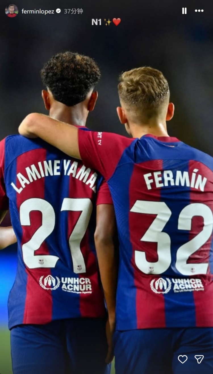 巴萨队友费尔明在个东说念主社媒晒出与亚马尔的合影示意救济,配文写说念:“你即是No1!”