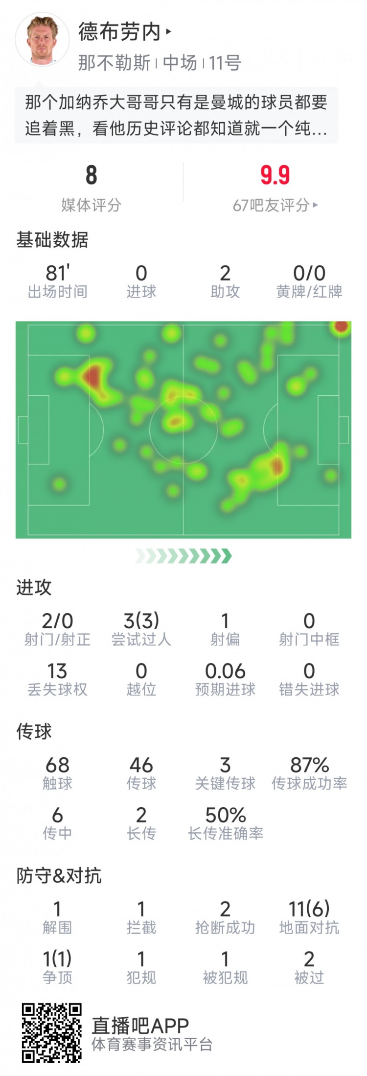 10月2日讯 在本轮欧冠那不勒斯对阵葡萄牙体育的比赛中,德布劳妃耦攻双响,以下为他在本场数据: