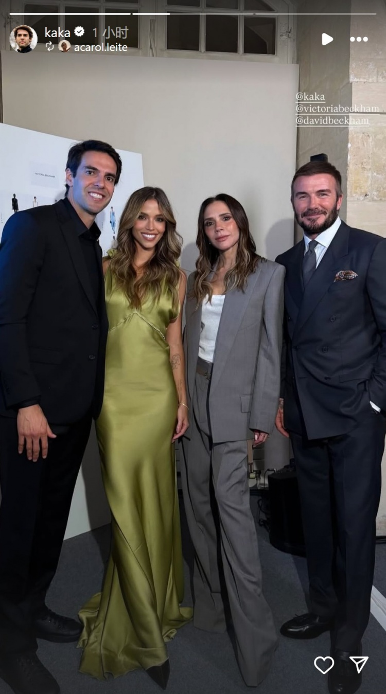 卡卡、贝克汉姆携夫东说念主出席算作,卡卡社媒晒出四东说念主合照。