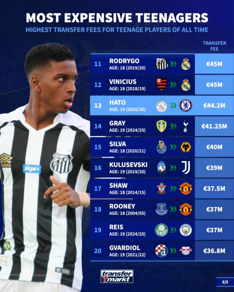 足坛历史U20球员转会费名次: