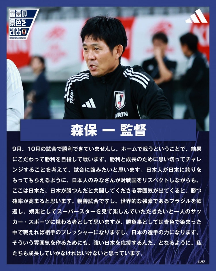 “固然仅仅一场海外友谊赛,但敌手巴西队是全国顶级球队。咱们接待他们的到来,不外比赛事关输赢,要是咱们的主场被蓝色的海洋所阴事,那也会给敌手带来压力,同期成为日本队的助力。但愿球迷们好像营造起氛围,为日本队提供强有劲的相沿,这也和咱们的成长息息干系。”