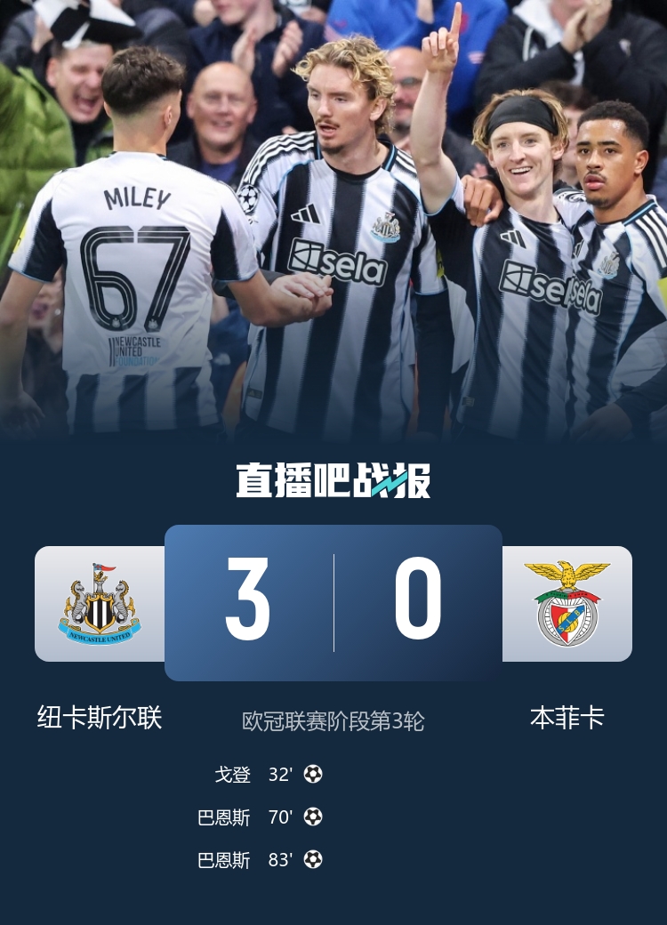 10月22日讯 欧冠联赛阶段第3轮首个比赛日收尾,3场英超球队(阿森纳、曼城、纽卡)的欧冠比赛齐奏效拿下凯旋且奏效零封敌手。