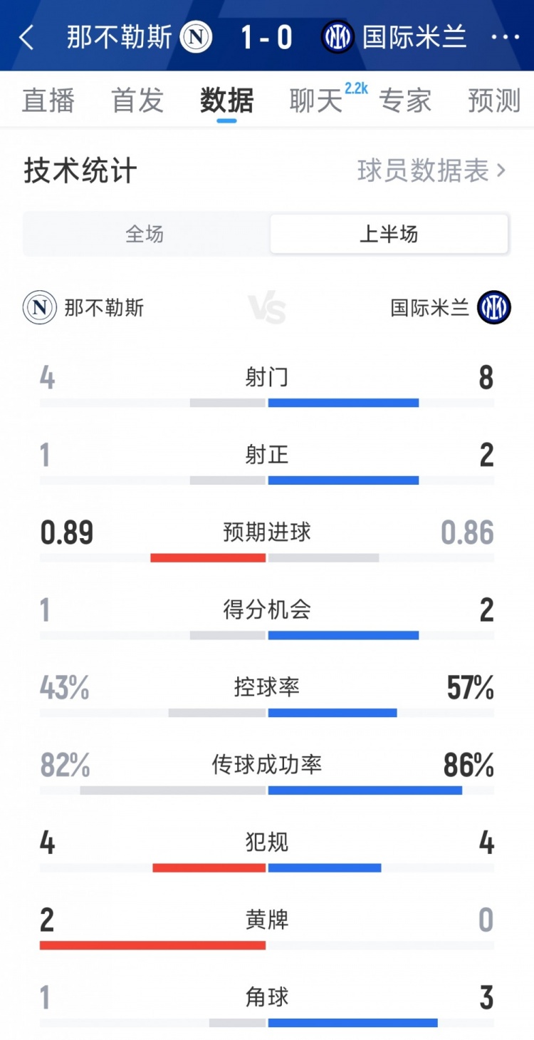 10月26日讯 本轮意甲国米对阵那不勒斯上半场适度,那不勒斯凭借德布劳内点球射中1-0逾越,以下为两边半场数据对比: