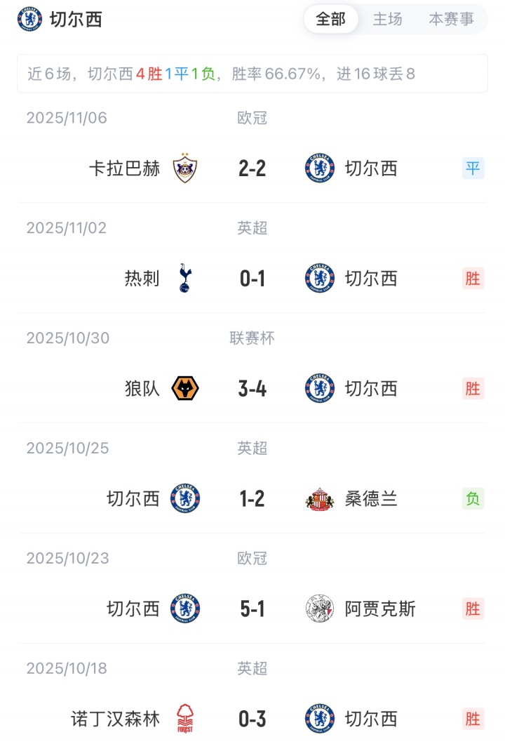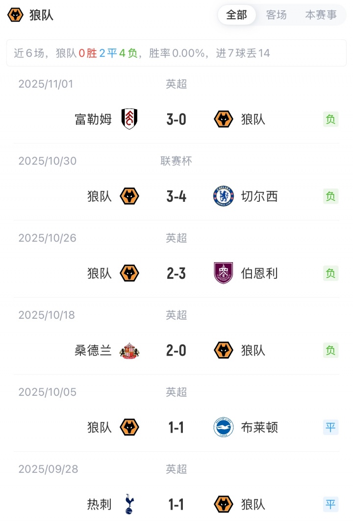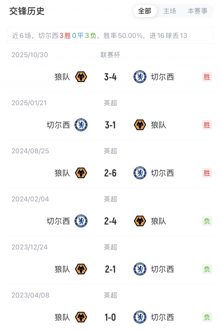 切尔西当今5胜2平3负,暂以17分排行第八。狼队0胜2平8负,以2分排行垫底。