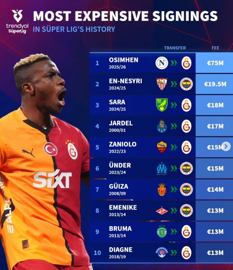 德转列土超历史买东谈主榜:奥斯梅恩断崖领跑,恩内斯里&扎鸟在列