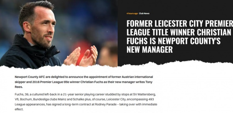 官方:39岁前莱斯特城英超冠军球员富克斯握教英乙纽波特郡