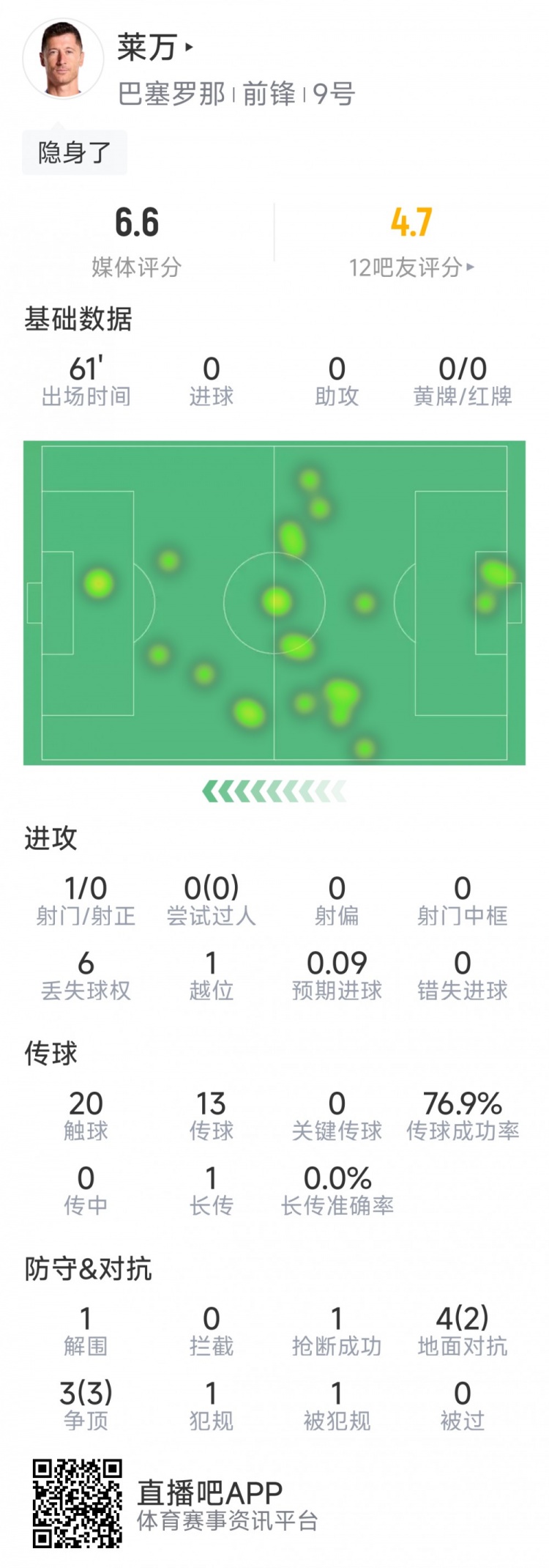 契机寥寥,莱万本场数据:1次射门0射正,7抵抗5得胜,评分6.6分