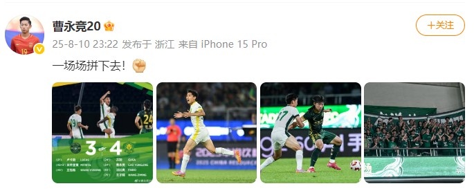 4-3逆转慑服浙江!曹永竞更新社媒:一场场拼下去!