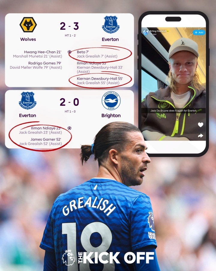 念念他了吗?格拉利什2场4助,哈兰德开吹:杰克-德布劳内在埃弗顿