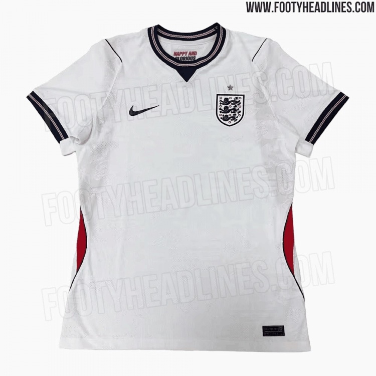英格兰队新款主场球衣秉承了经典的白色底色,搭配邃密的提花图案、肩部的舟师蓝镶边以及两侧带有舟师蓝边际的红色插片。球衣领口内侧印有“HAPPY AND GLORIOUS(英国国歌《天助女王》里的歌词,译为孚民望,心雀跃)”的口号,而队徽上方的一颗金色星星则顾忌了1966年寰宇杯冠军。