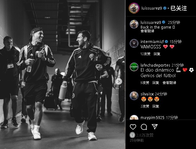 赛后,本场解禁复出的苏亚雷斯晒出我方和梅西的合照并配文:追念赛场。
