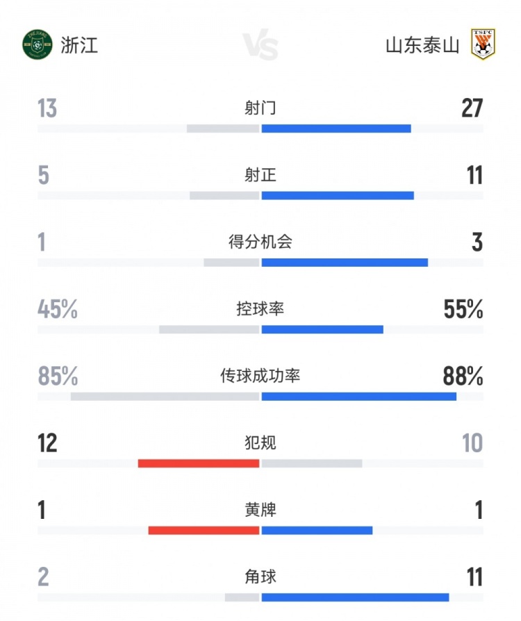 浙江2-2泰山数据:射门13-27,射正5-11,得分契机1-3,角球2-11