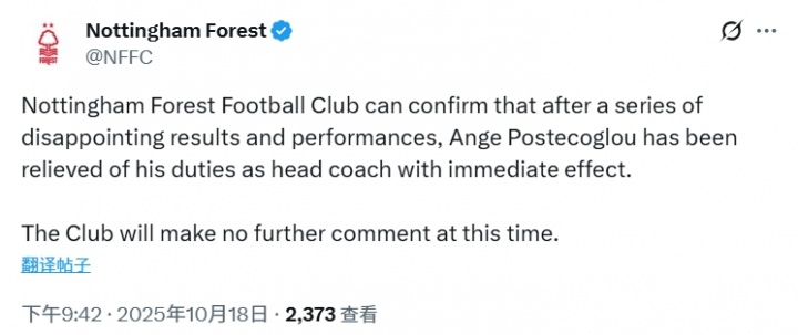 上任仅39天+带队8场2平6负0胜绩!官方:诺丁汉丛林主帅澳波下课