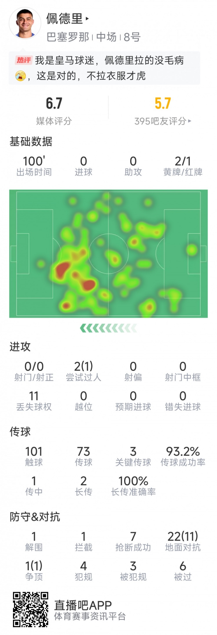 佩德里本场数据:3次要道传球,7次抢断,终末技艺两黄被罚下