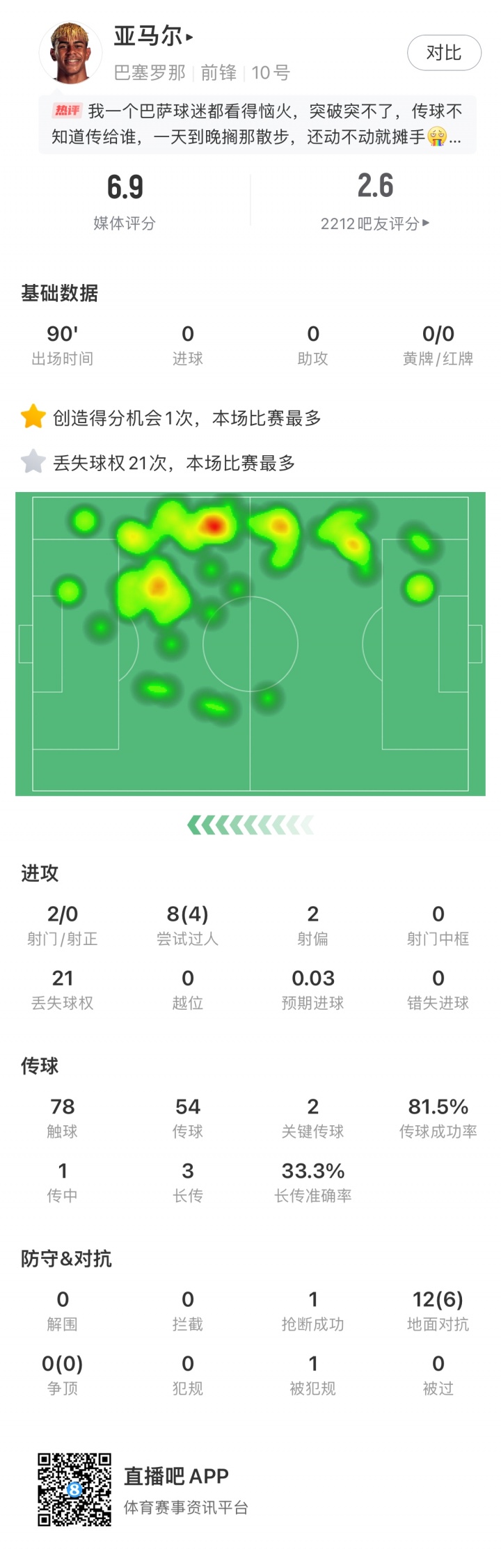 10月27日讯 本赛季首场西班牙国度德比皇马驯顺巴萨,本场比赛巴萨小将亚马尔樗栎庸材,这与赛前他的高调酿成反差!亚马尔本场2射0正+2关节传球 8过东说念主4见效+21丢失球权获评6.9分!
