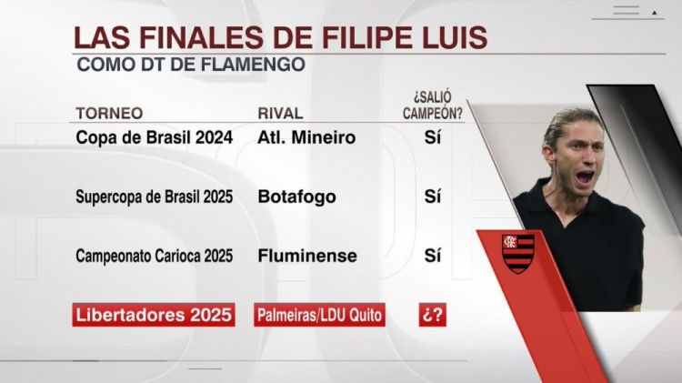 据ESPN统计,费利佩-路易斯捏教弗拉门戈以来带队参预3场决赛,包括2024年巴西杯决赛、2025年巴西超等杯决赛、2025年里约热内卢联赛决赛,沿路取胜,决赛胜率100%。