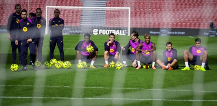 球员们分红三组进行传球练习,之后进行了小场比赛,分为两队:穿绿背心和不穿绿背心,两名中场(德容和奥尔莫)交替。穿绿背心的一方有:费兰-托雷斯、亚马尔、德罗、库巴西、克里斯滕森、巴尔德、卡萨多和埃斯帕特。不穿绿背心的一方有:阿劳霍、埃里克-加西亚(戴着面具)、拉什福德、托尼、伯纳尔、费尔明、巴德吉、莱万和托伦茨。