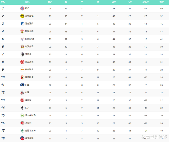 德甲23轮战罢,目前还剩11轮,拜仁3-2惊险战胜法兰克福,而多特蒙德2-2绝平RB莱比锡,这样拜仁积分来到60分继续领跑德甲,领跑 第二位的多特蒙德8分。
