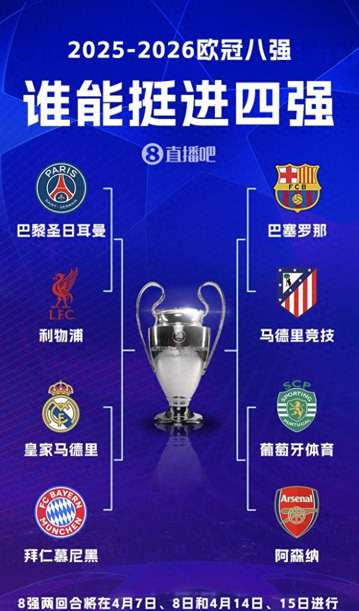 今天看到欧冠八强名单终于全出来了,比之前想的还怪一点。皇马、巴萨、马竞全进去了,曼城、阿森纳、利物浦也都在,西甲英超刚好三队并排,一个没少。本来以为拜仁起码能带个勒沃库森或者斯图加特来撑场面,结果德甲就它自己,意甲好歹拉回个国米,比去年强点,亚特兰大真没进,输给本菲卡了。