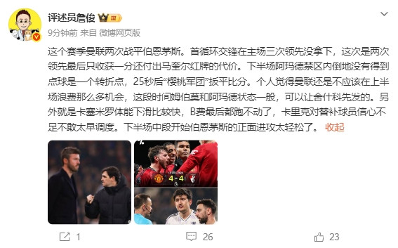 直播吧03月21日讯本轮英超曼联2-2战平伯恩茅斯,赛后评述员詹俊发文点评。