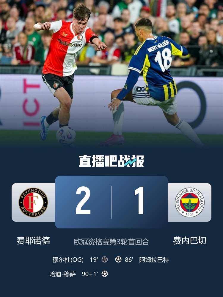 欧冠履历赛第3轮首回合,费内巴切1-2遭费耶诺德绝杀。
