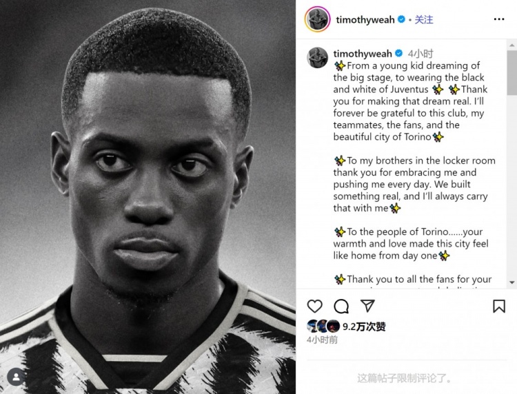 蒂莫西-维阿社媒写说念:“从一个梦思登上大舞台的小男孩,到身披尤文曲直战袍的球员,感谢你们让这个梦思成真。我将永远感恩这家俱乐部、我的队友、球迷以及好意思艳的王人灵城。