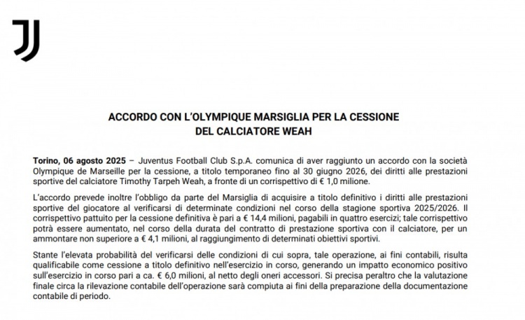 尤文在文献中写谈:“俱乐部晓谕,已与马赛达成合同,以临时转会的面孔将球员维阿的代表权转让至该俱乐部,租期至2026年6月30日,租出费为100万欧元。”