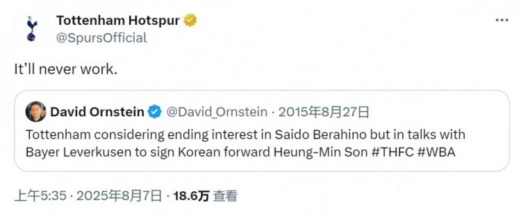 知名记者David Ornstein在2015年夏窗社媒发文,泄露热刺正在商谈引进勒沃库森时尚孙兴慜,不外那时一些球迷并不看好这笔签约。